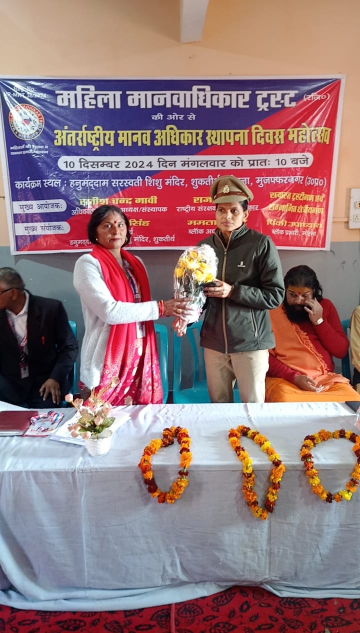 आज महिला मानवाधिकार ट्रस्ट रजिस्टर्ड द्वारा अंतरराष्ट्रीय मानवाधिकार स्थापना दिवस 10 दिसंबर 2024 दिन मंगलवार को हनुमत धाम सरस्वती शिशु मंदिर सुक ती र् थ मुजफ्फरनगर मैं मनाया गया इस मंदिर के प्रतिभाशाली बच्चों को प्रतीक चिन्ह देकर समान किया मंच पर उपस्थित मुख्य अतिथि उप निरीक्षक अजय यादव उनके साथी महिला कांस्टेबल शुक्र ताल चौकी प्रभारी उप निरीक्षक शैलेंद्र जी मंच की अध्यक्षता स्वामी विद्